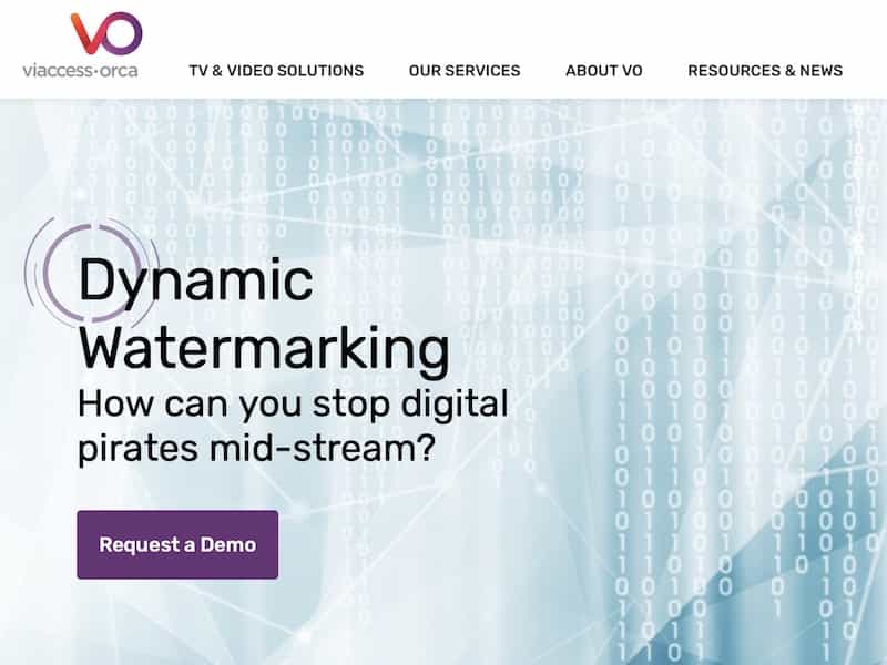Al centro della nuova soluzione c'è la tecnologia di watermarking dinamico di VO, che presenta algoritmi multipli e dinamici con la capacità di tracciare e modificare i watermark in tempo reale. Poiché i proprietari di contenuti distribuiscono contenuti live a più affiliati, la soluzione traccia il suo percorso attraverso diversi canali, inclusi satellite e IP, iniettando una filigrana invisibile sul video in ogni punto di distribuzione.