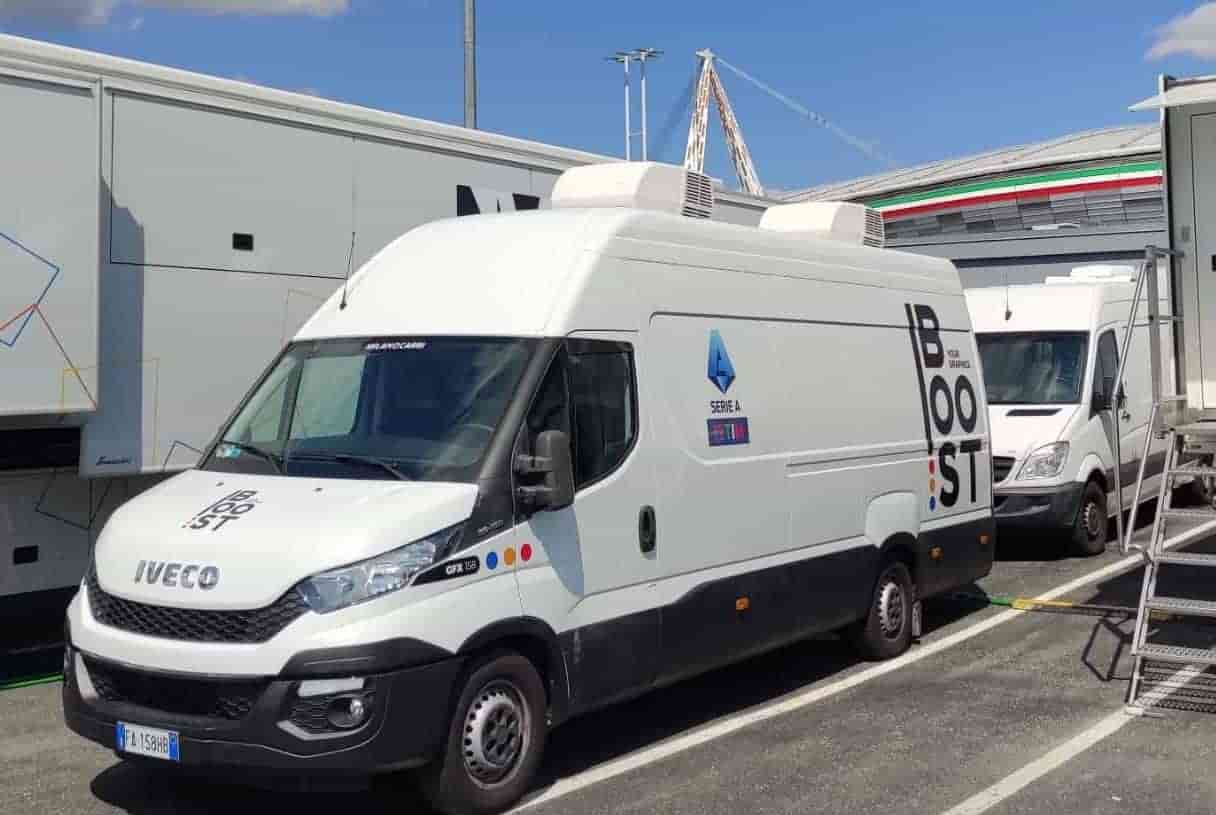 Nella tipica produzione on-site il van di Boost consegna i segnali di chiave e fill per la grafica e i dati al mezzo mobile on site.
