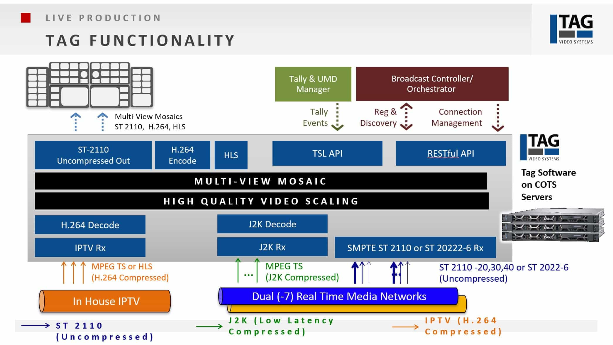 TAG Video Systems, distributed and followed in Italy by CVE Communication Video Engineering, presented its first IP solution in 2008 and today supports over 100,000 probing / monitoring points in the four main broadcast applications: live production, playout, distribution and OTT, operating 100% SW, 100% IP, 100% COTS.