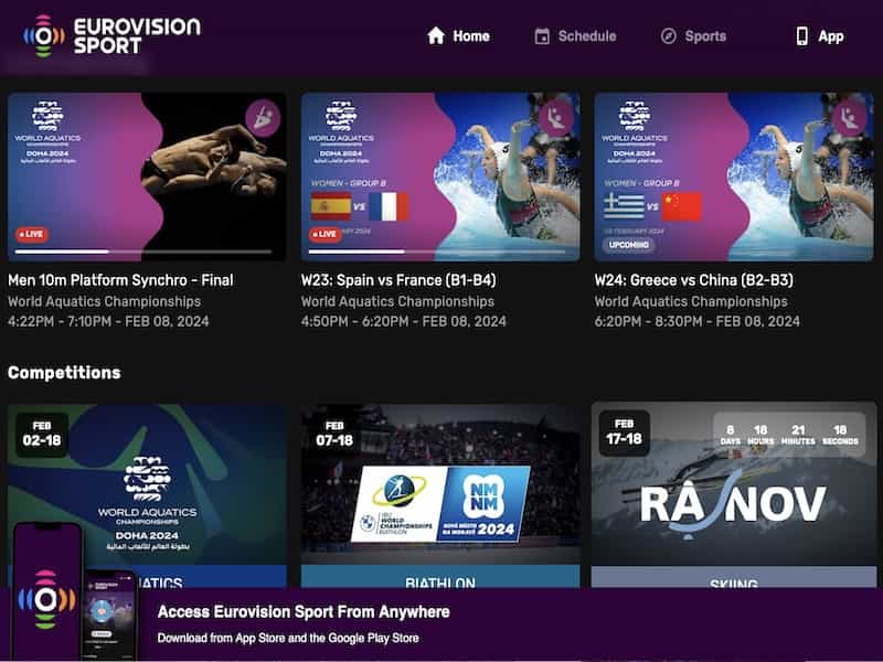 Eurovision Sport è disponibile per il download dai negozi di app Android e iOS, nonché sul web e sul web mobile su: https://www.eurovisionsport.com
