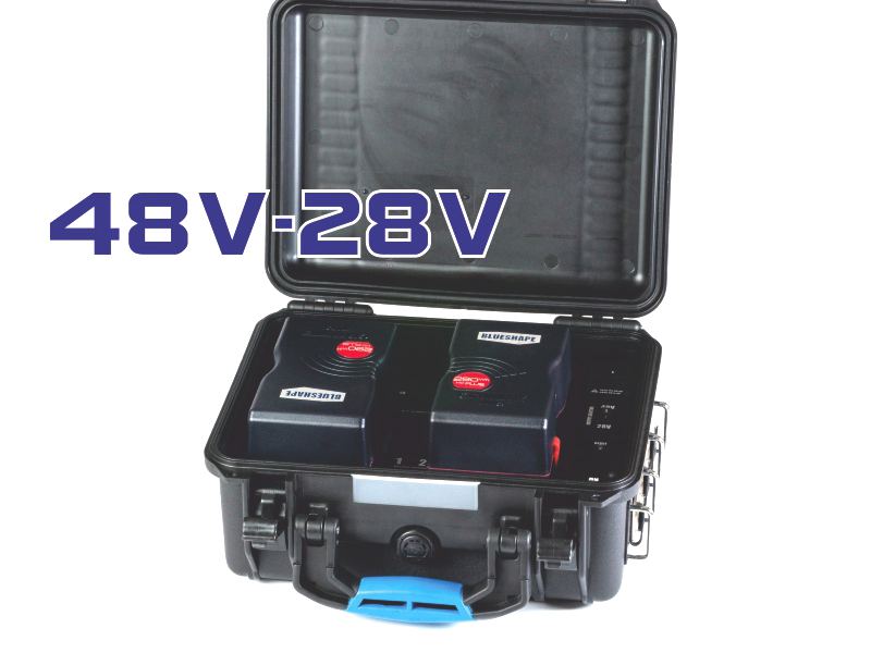 Il concetto di centrale elettrica per BLUESHAPE è un sistema che permette di integrare la potenza di più batterie V-lock in una fonte unica che può essere sfruttata ovunque e in qualsiasi momento, come una doppia uscita a corrente continua simultanea che fornisce una gamma di opzioni a 48V, 28V e 14V.