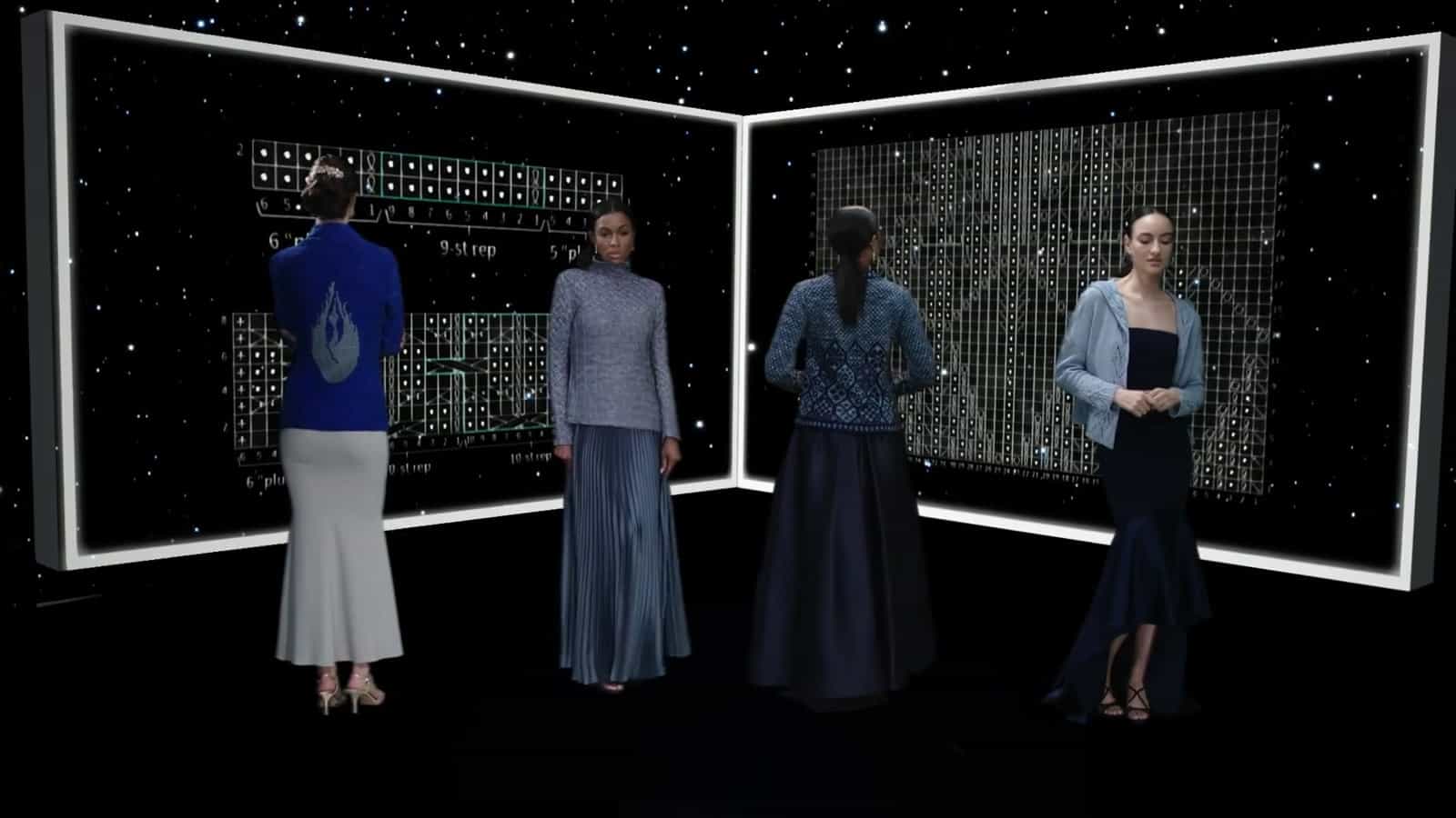 Invece, Quinn si è avvicinata al team di Jett Sets, che ha utilizzato il loro studio per portare lo spettatore attraverso una sfilata di moda virtuale che mostrava il processo creativo di progettazione di ogni maglione, sciarpa e cardigan dallo schizzo alla fine.